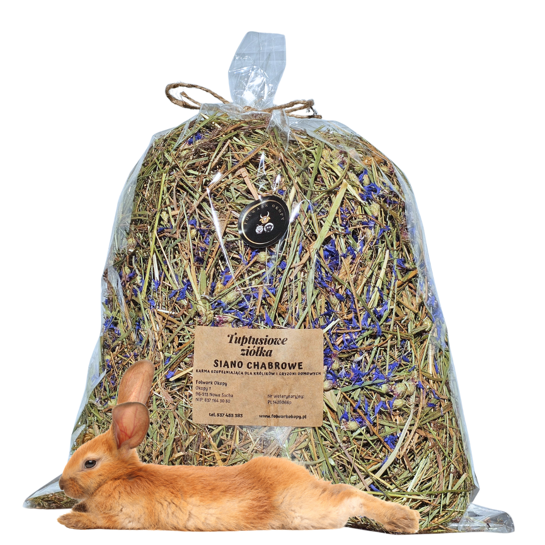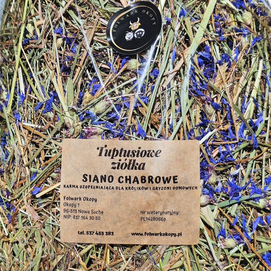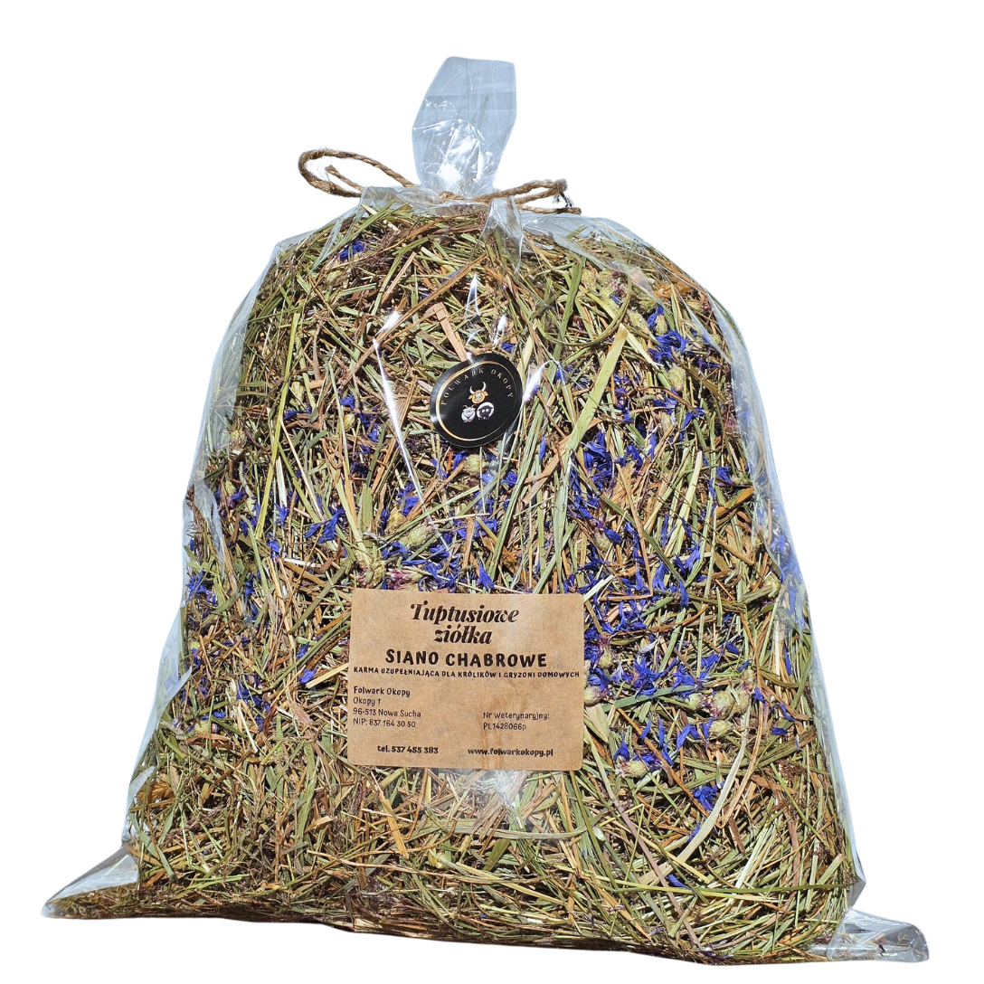 Siano chabrowe to siano majowe - łąkowe - odpylone - zebrane z naszych ekologicznych łąk wzbogacone suszonym kwiatem chabra bławatka.