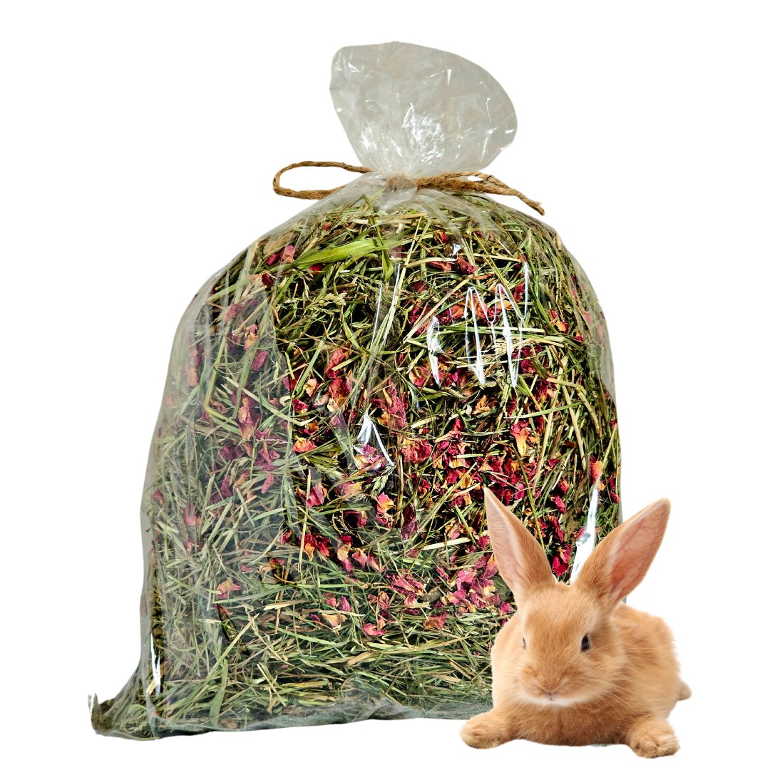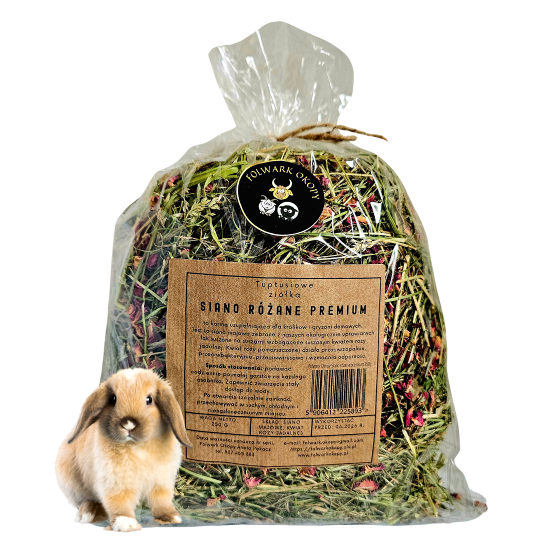 Skład: siano majowe (90%), suszone płatki róży jadalnej (10%)