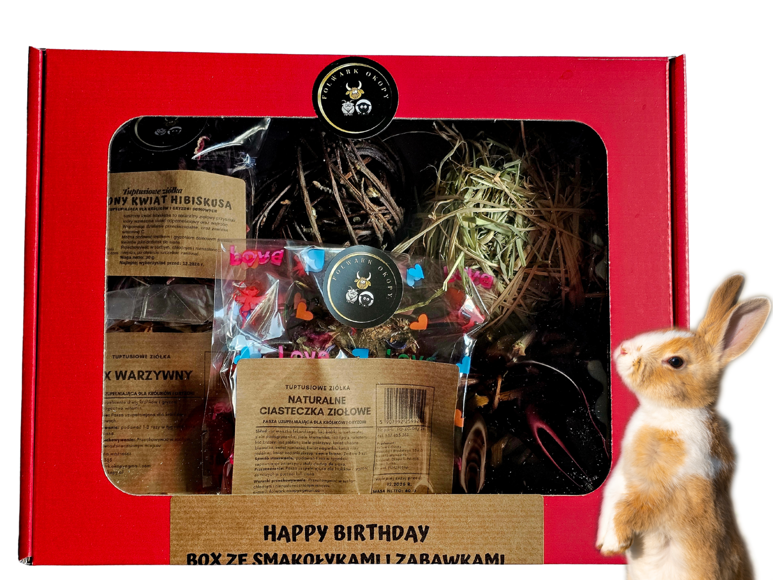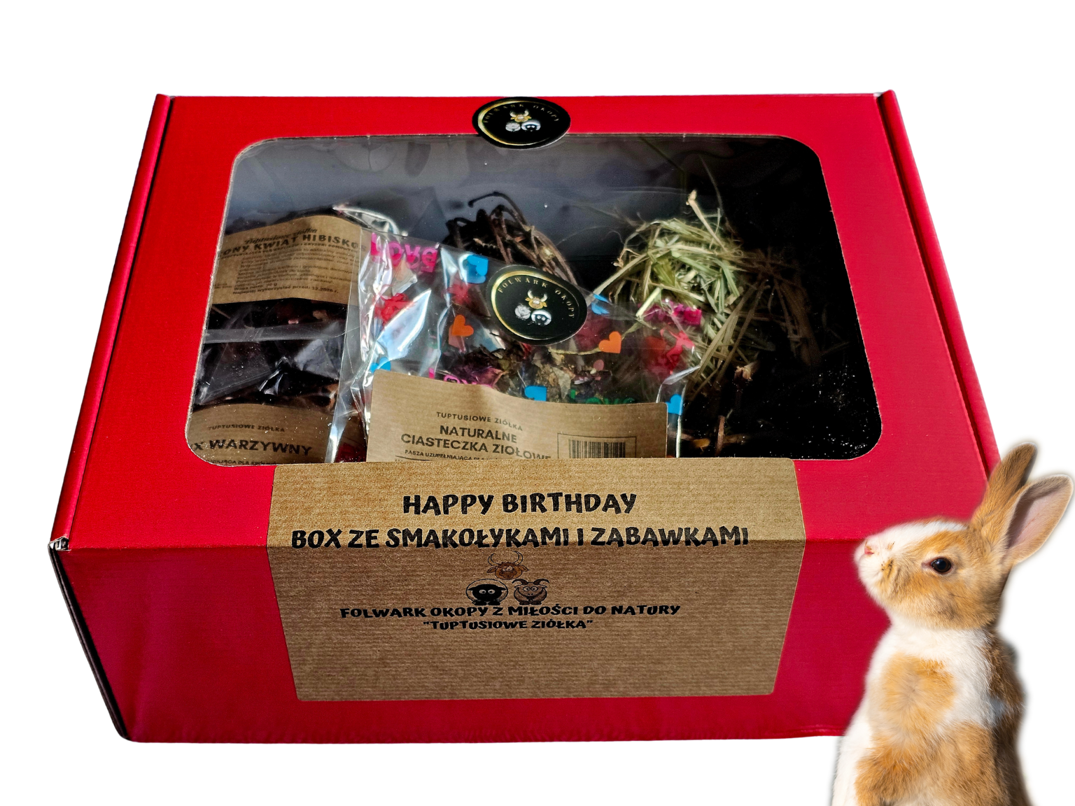 Urodzinowy Box naturalnych przysmaków i zabawek dla królika i gryzonia – Folwark Okopy