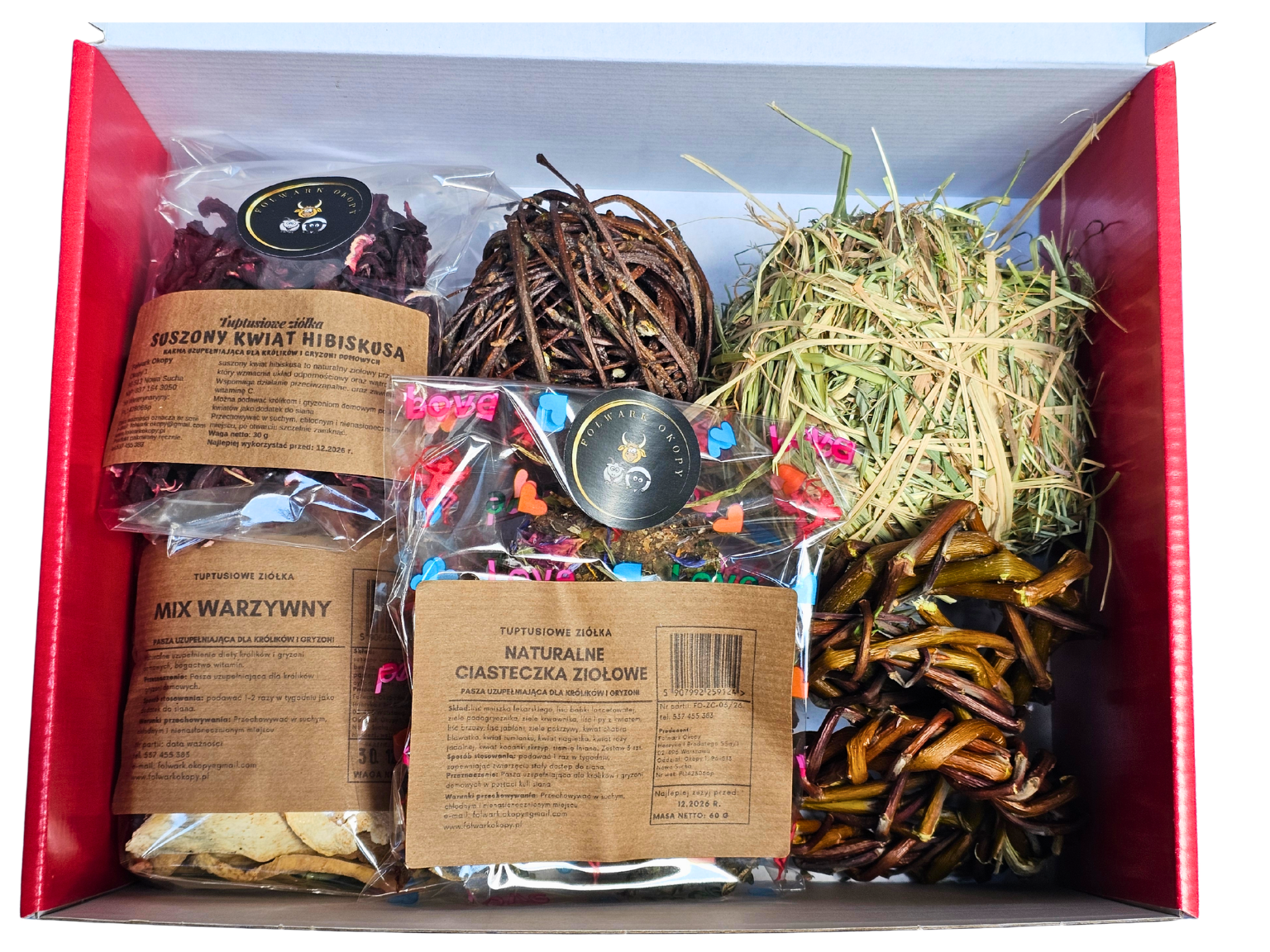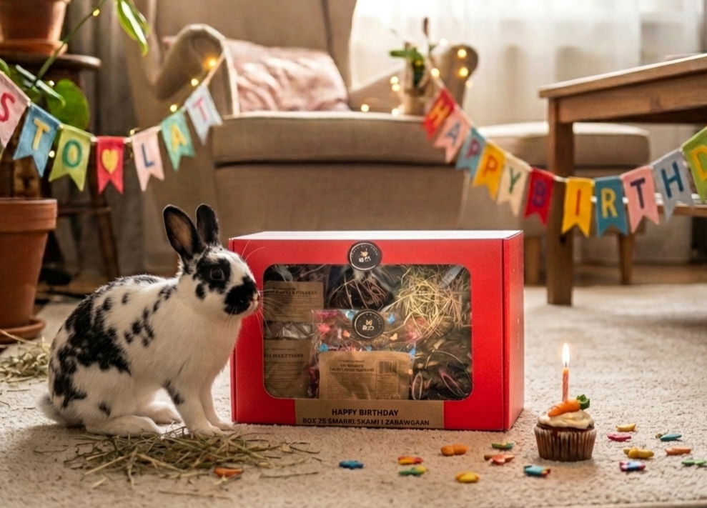 Podaruj swojemu pupilowi coś wyjątkowego! Urodzinowy box od Folwark Okopy to starannie skomponowany zestaw naturalnych przysmaków i bezpiecznych zabawek, który zapewni Twojemu królikowi lub gryzoniowi radość, zdrowie i aktywną zabawę.