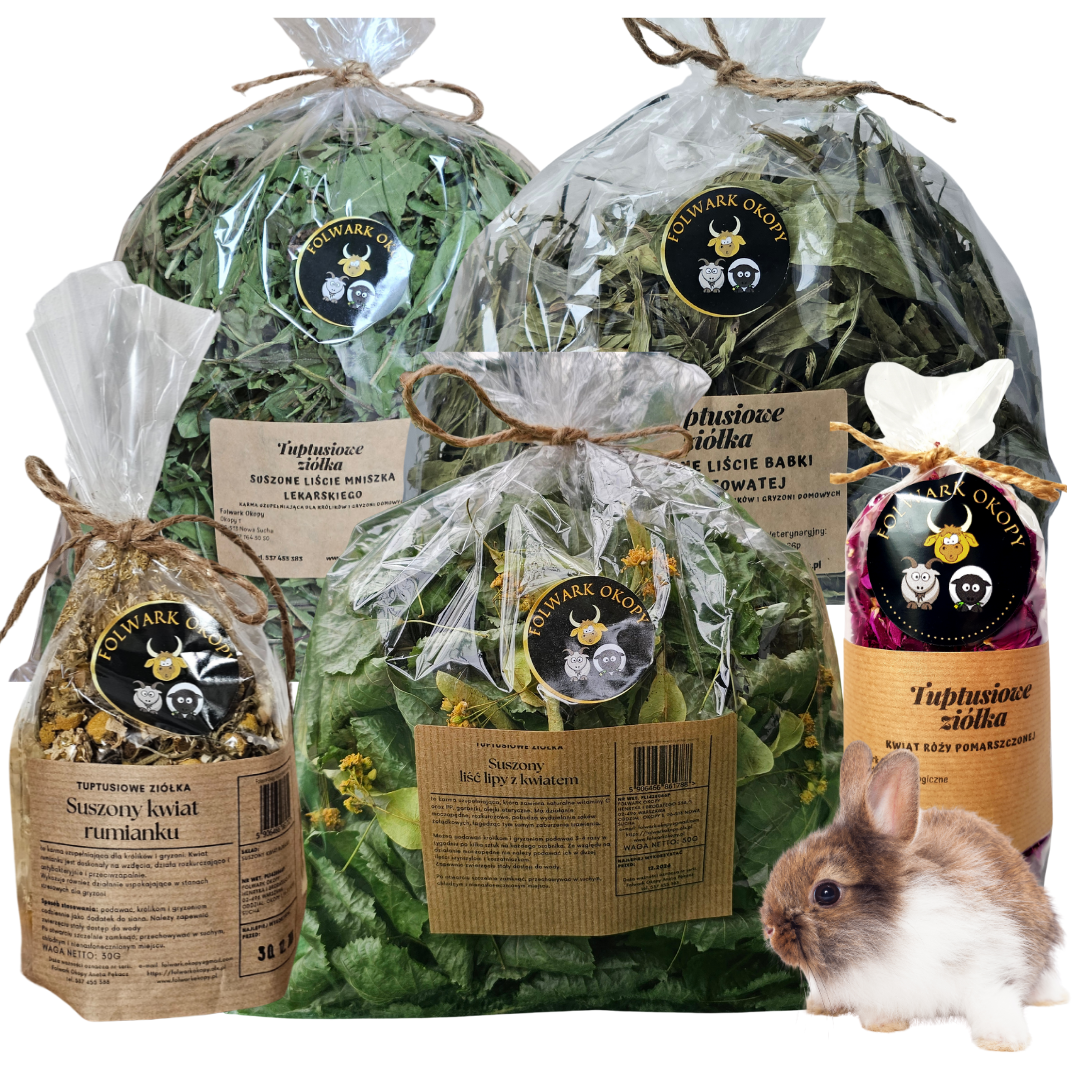 Nasz zestaw startowy ziół dla królików od 4. miesiąca życia to starannie dobrana kompozycja suszonych roślin, idealna do bezpiecznego i stopniowego rozszerzania diety młodego królika.